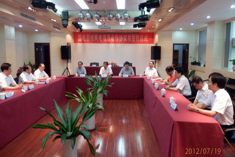 719上午,安徽农垦华阳河农场、宿松县人民政府与中国国电集团安徽电力有限公司三方风电合作项目签约仪式在合肥举行。仪式由宿松县常务副县长梅耐雪主持,省农垦集团纪委书记储诚胜、国电安徽公司总经理史太平、宿松县县长王华、华阳河农场场长孙国安出席仪式。省农垦集团及华阳河农场、国电安徽公司、宿松县政协及发改委相关负责人参加了签约活动。