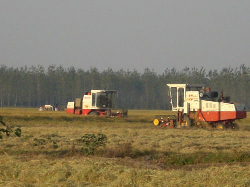 10月19日,秋高气爽,天空晴朗。位于高邮湖畔的大圹圩农场抓住晴好天气,不失时机,组织机械力量,展开秋收会战,迅速掀起秋收高潮。针对今年水稻受台风影响倒伏比较严重不利局面,这个场灵活采取多种形式,采取水稻割晒与直收并举,全力以赴突击抢收水稻。在农场一望无际的稻田里,各种割晒机、脱粒机各显其能抢进度,各农业管理区呈现出一派紧张繁忙的抢收景象,据统计当天共抢收水稻1600多亩。天长电视台也闻讯赶到现场拍摄镜头,展示农场发展现代农业,水稻喜获丰收的秋收画面。据预测,这个农场今年1.7万亩优质机插秧水稻在涝灾虫害频繁发生的大灾之年,总产有望达900万公斤,平均单产在550公斤左右。