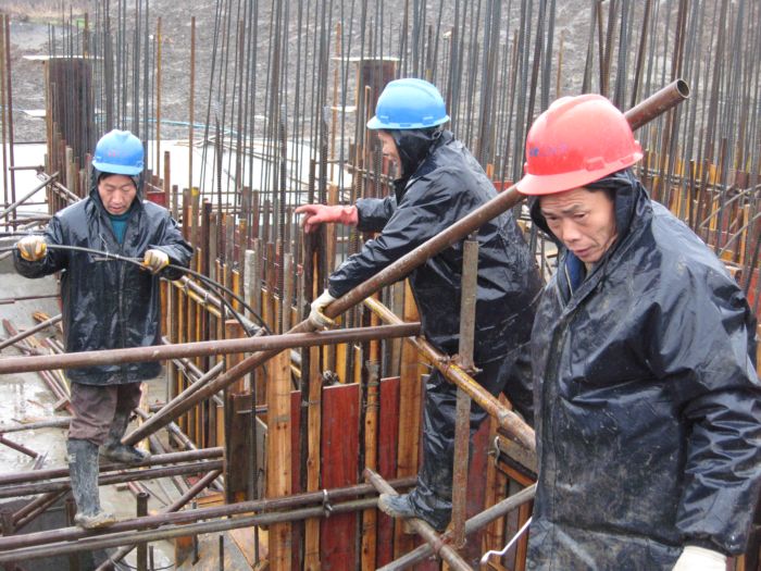 2月27日上午,在投资3185万元的农垦皖河大型泵站工程北场站工地上,施工人员在雨中绑扎泵室脚手架,为下步混凝土立模做准备。当日小到中雨,工地上有40多人施工。自2月中旬以来,施工单位一直冒雨施工,保证每天12小时的工作时间,力争汛前完成泵站建设任务。(王洪 摄)