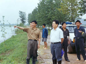 图为丁俊先董事长(前左二)在东风湖农场检查灾 情,指导工作。