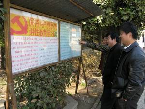 潘村湖农场是明光市第一批开展保持共产党员先进 性教育活动单位之一.农场党委精心组织、扎实推 进,切实抓好先进性教育活动各阶段、各环节工 作。连日来,全场19个党支部的400余名党员围绕新 时期共产党员先进性具体要求展开了热烈讨论,并 利用广播、场报、橱窗等形式广泛宣传,发动群众 参与评议,促进了先进性教育活动深入开展,取得 良好效果。图为职工群众在观看先进性教育活动宣 传橱窗的情景。(杨登宏摄)