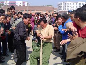 图片说明:为庆祝“五一”、“五四”节日的到 来,连日来,龙亢农场工会组织开展拔河、自行车 慢骑、羽毛球、卡拉OK、演讲等,全场近千名职工 群众参与活动,丰富了职工业余文化生活。图为男 子拔河比赛。(王戴群)